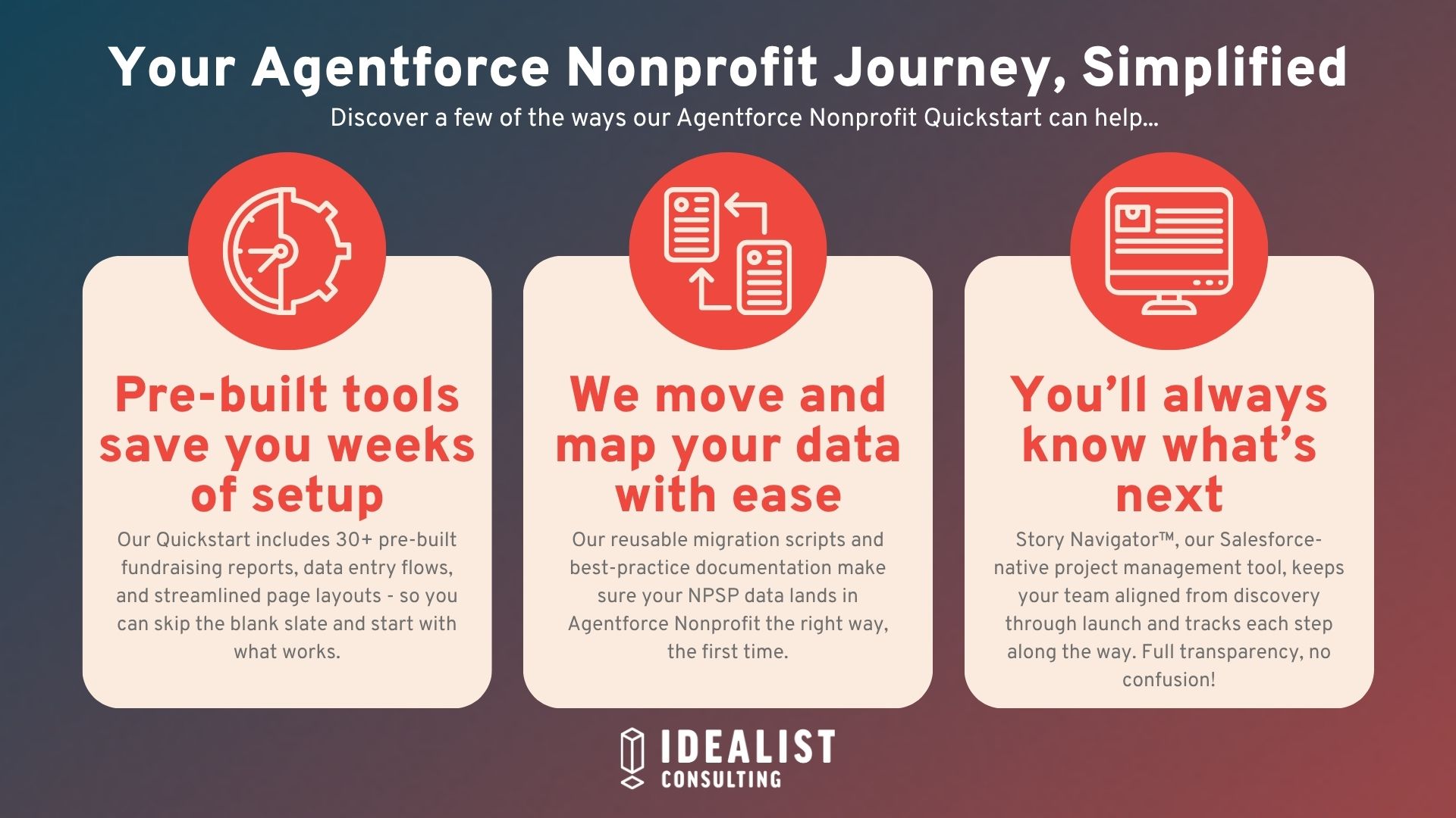 While Agentforce Nonprofit Quickstart gets you up and running fast, clients still get access to the Idealist Way, our unique service delivery model, and Story Navigator, our Salesforce-native project management tool. This includes a discovery phase to understand your needs and workflows, using pre-built user stories as a starting point. This proven, efficient process - honed through years of nonprofit implementations - delivers a tailored, high-quality solution in a compressed timeframe.